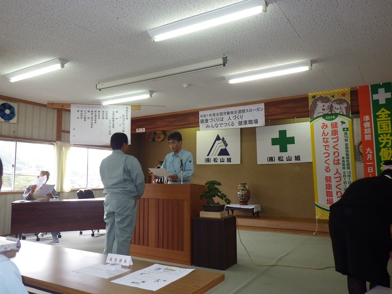 2019年10月5日2019年10月7日 株式会社松山組中川 令和元年度松山グループ衛生大会等を行いました。 令和元年度松山グループ衛生大会等を行いました。 10月1日から始まった全国労働衛生週間に伴い衛生大会及び健康診断を行いました。 大会では社員からの標語の募集作品の発表並びに表彰、講話は「アルコール と肝臓の上手な付き合い方」を行いました。 大会の様子 表彰 健康診断 レントゲン車と胃の検査車